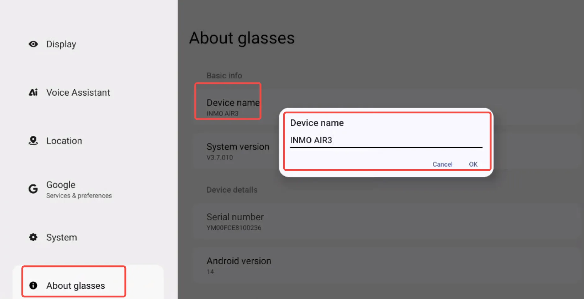② Tap “About the Smart Glasses” → View the smart glasses’ basic information: [Device Name], [System Version].