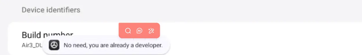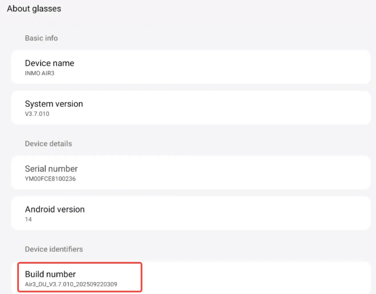 Section titled “Part 2 Enable Developer Mode”① About the Smart Glasses → Device Identifier [Build Number], which is the version number of our smart glasses.