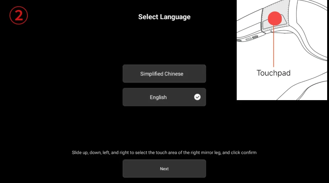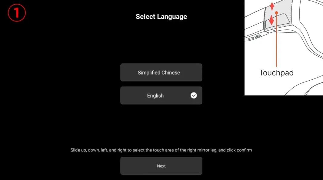 Section titled “Part 1 Select language”① Select Language: Scroll up or down on the right temple’s touch control to choose your desired language.