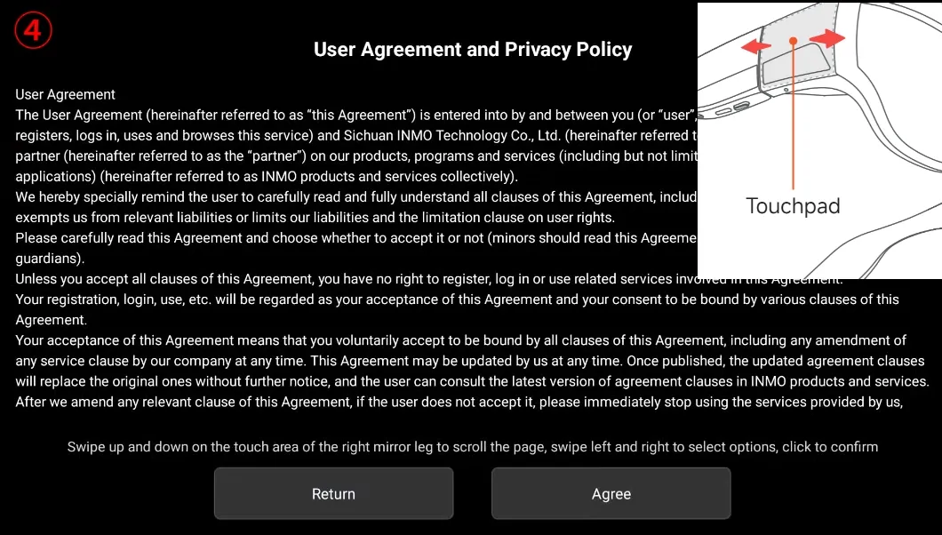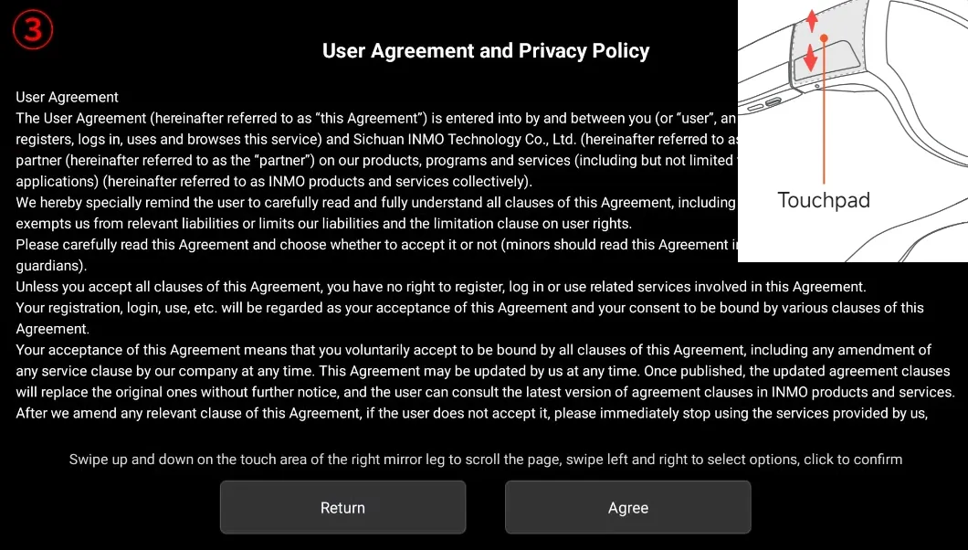 Section titled “Part 2 Agreement”③ User Agreement and Privacy Policy: Scroll up or down on the right temple’s touch control to view the User Agreement and Privacy Policy.