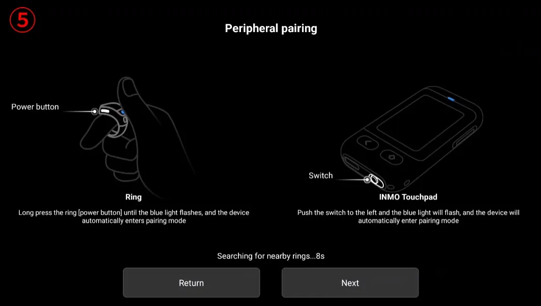 Section titled “Part 3 Pairing ring control and touchpad device”⑤ Peripheral Pairing: Connect the “Ring” or “Touchpad.” Once connected successfully, it will automatically proceed to “Ring Interaction Instructions” (if a Touchpad is connected, it will redirect to “Touchpad Interaction Instructions”).