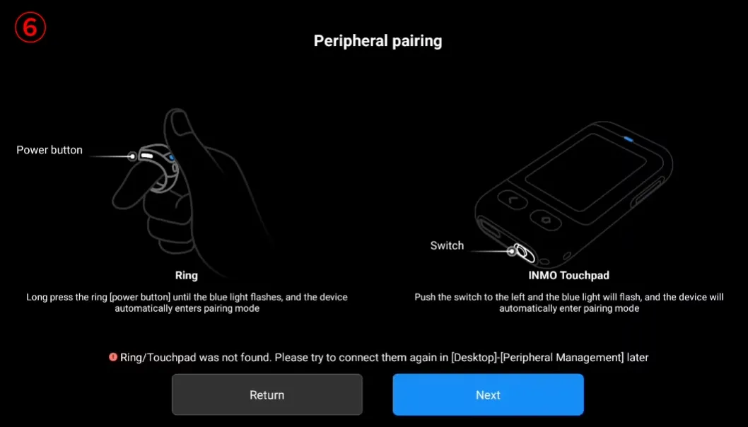 ⑥ If you choose not to pair the “Ring” or “Touchpad” at this time, you can connect them later under “Desktop” - “Peripheral Management.” Tap “Next” to proceed to “Ring Basic Interaction Instructions.”