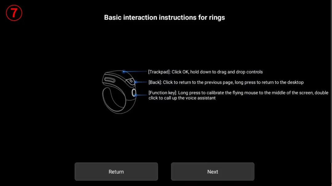 Section titled “Part 4 Familar with ring control”⑦ Ring Basic Interaction Instructions: Access “Ring Basic Interaction Instructions” and review the Ring interaction instructions. Tap “Next” to test the Ring’s connectivity.