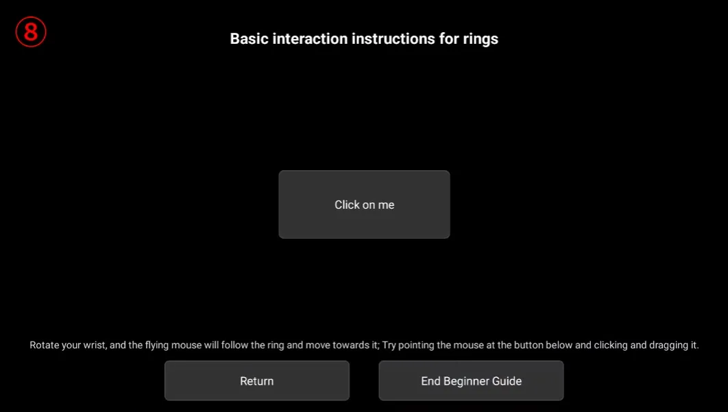 ⑧ Testing and Exiting: Within the current window, users can single-tap the central square using the Ring to verify its proper function. Once the test is complete, tap “End New User Guide” to exit.