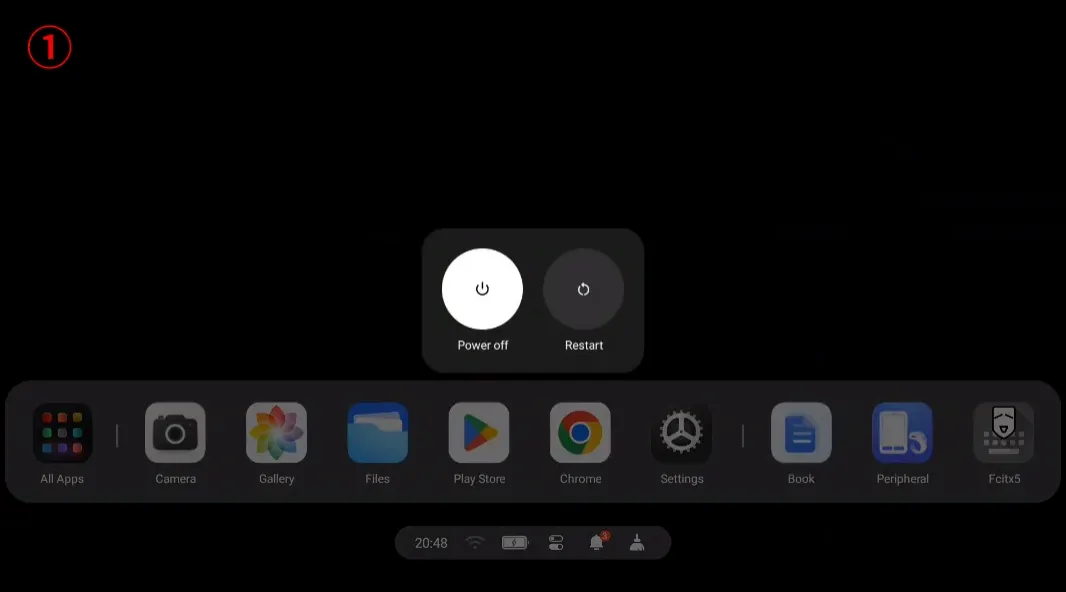 Section titled “Part 5 Power on/off and restart your glasses”① Power Off/Restart: While the device is powered on, press and hold the power button on the temple for 3 seconds to display the power options menu. Swipe the touchpad to select “Shut down” or “Restart.”