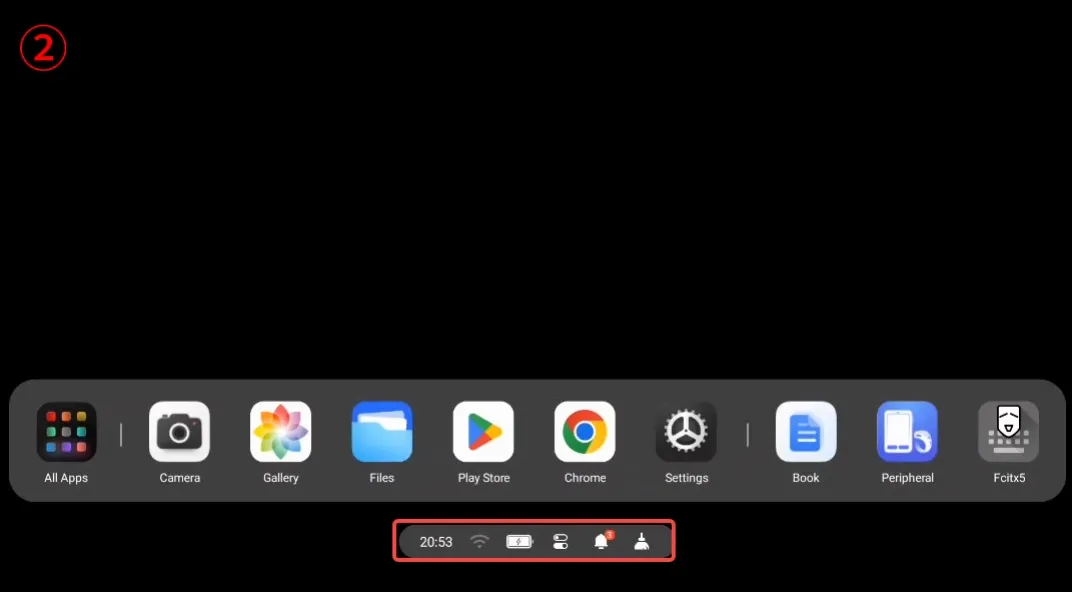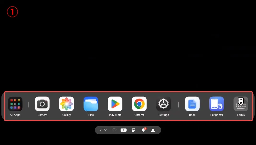 Section titled “Part 1 - Desktop overview”① On the Desktop, the Quick App Bar is displayed at the bottom. From left to right, it features: App Library, Frequently Used Apps, and Recent Apps.