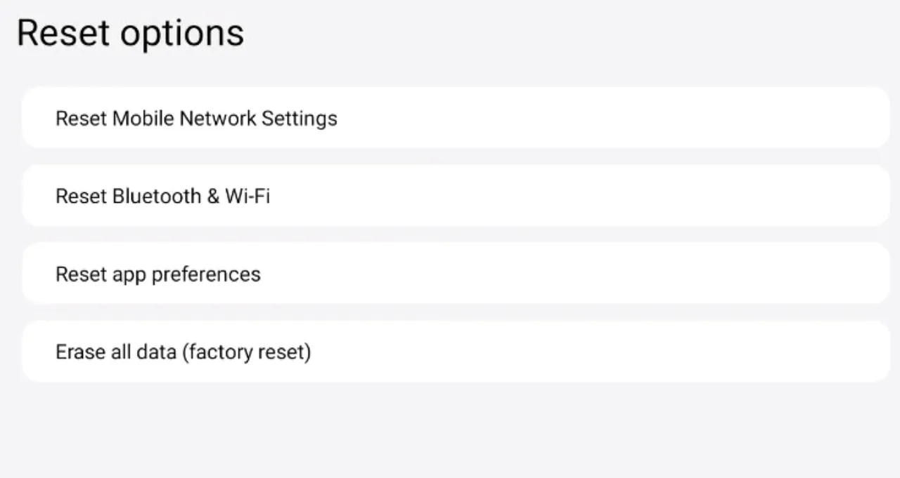 ③ Tap “System” → “Reset Options” → You can select the following options: Reset Mobile Network Settings, Reset Bluetooth and WLAN, Reset App Preferences, and Erase All Data (Factory Reset).