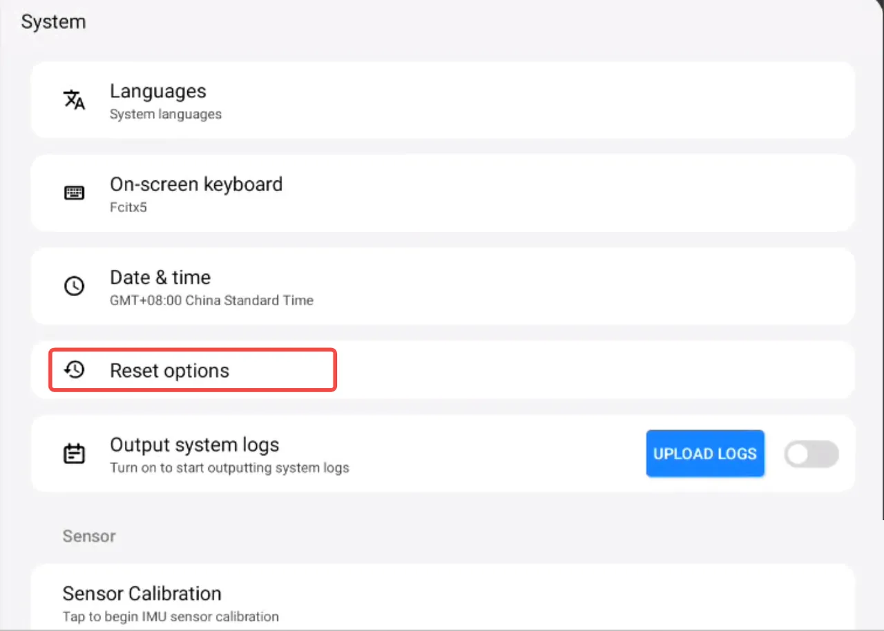③ Tap “System” → “Reset Options” → You can select the following options: Reset Mobile Network Settings, Reset Bluetooth and WLAN, Reset App Preferences, and Erase All Data (Factory Reset).