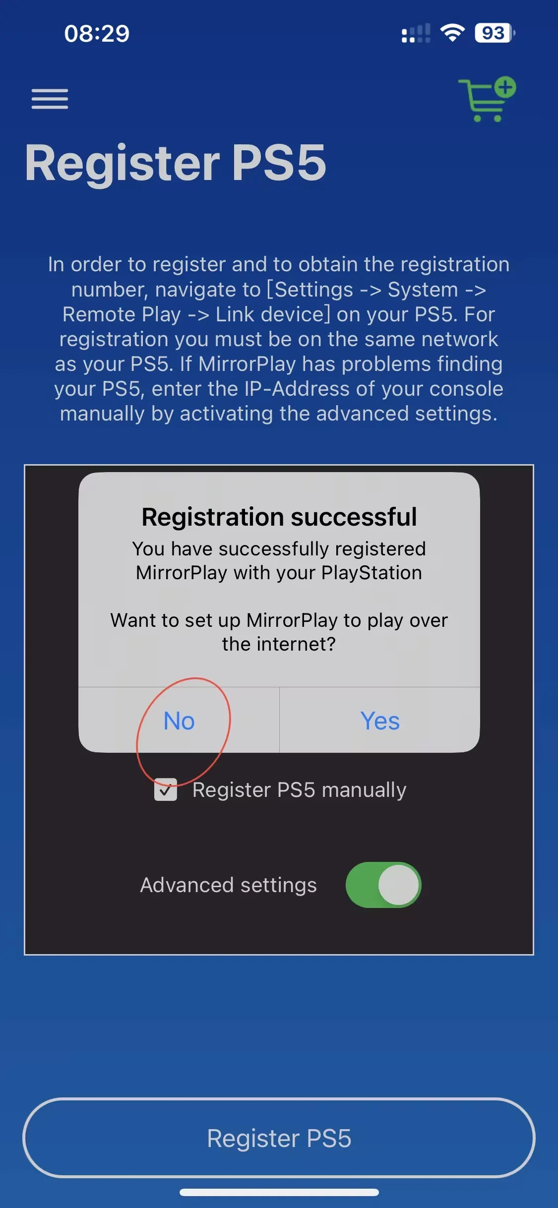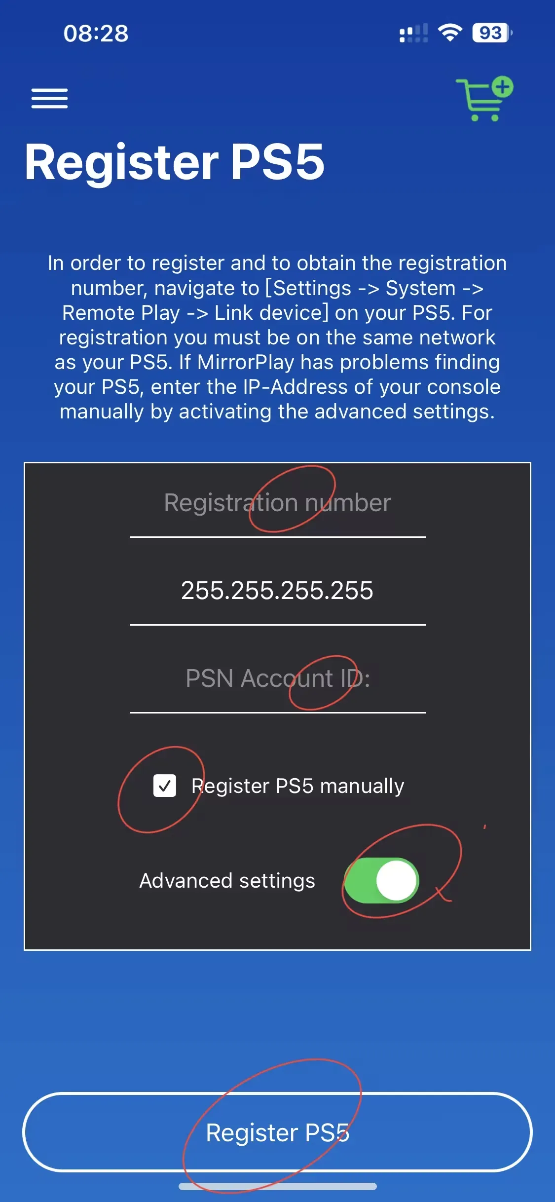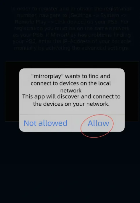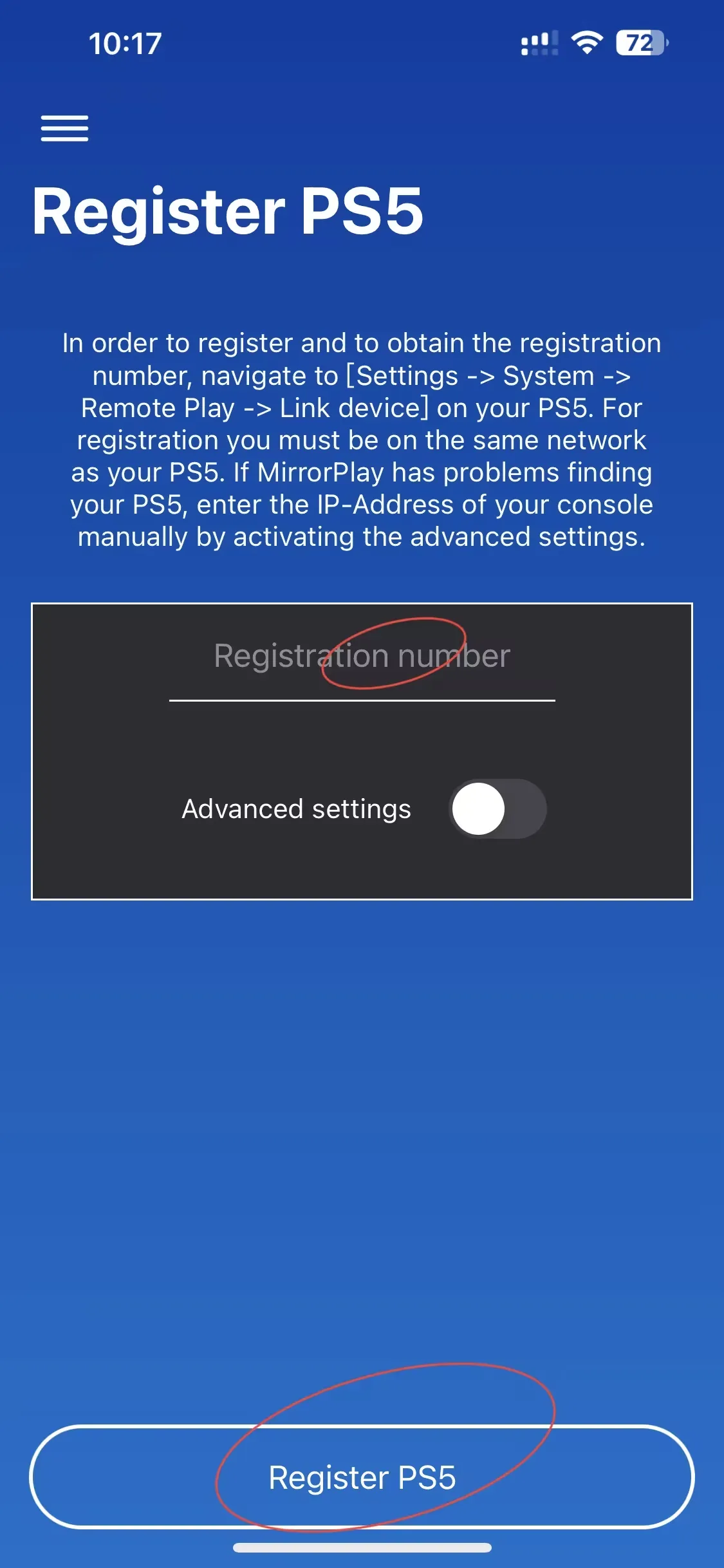 - Enter the pairing code currently displayed on your PS console in the Registration number field, then tap Register PS5 (Register PS5) at the bottom.