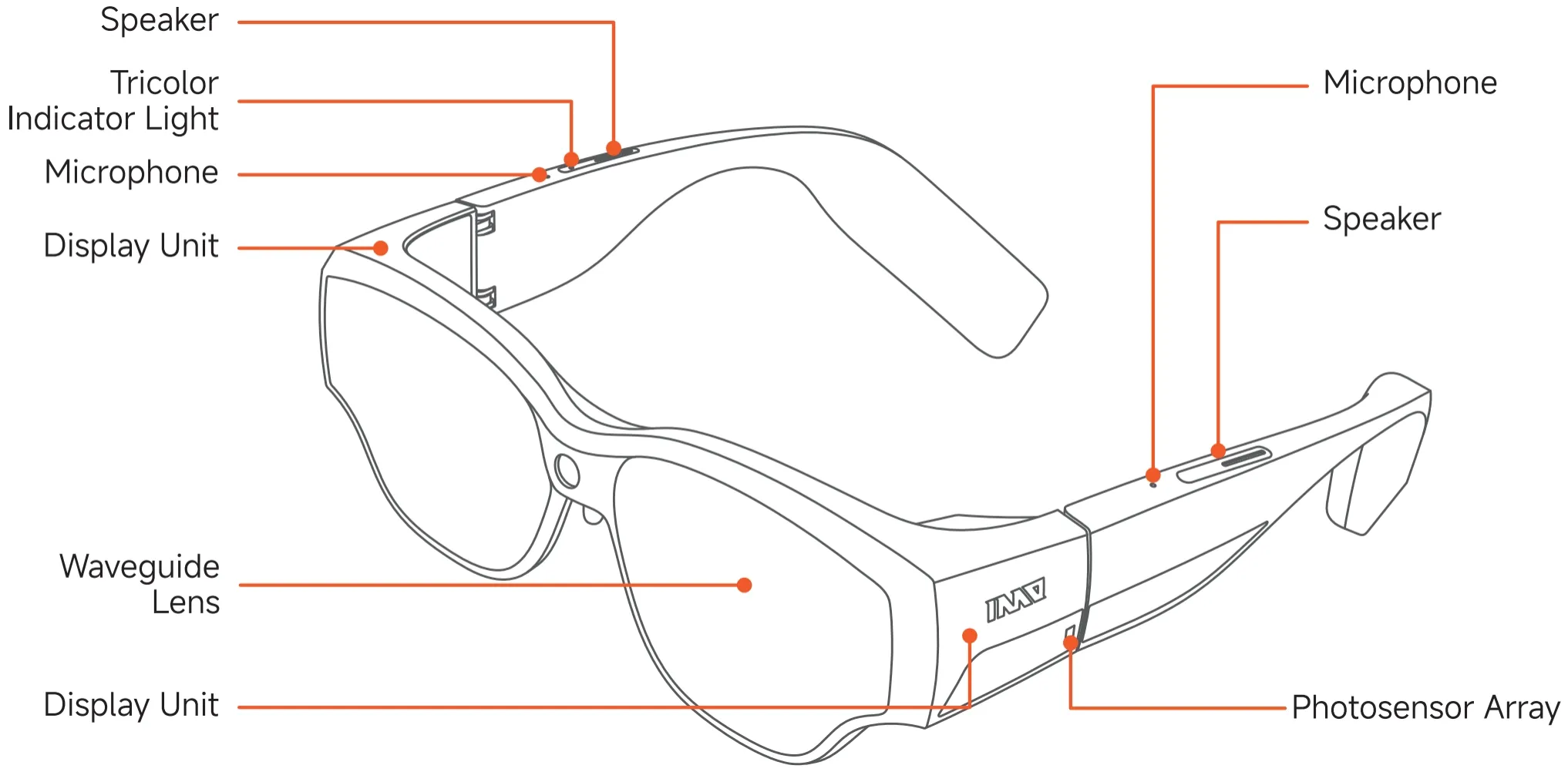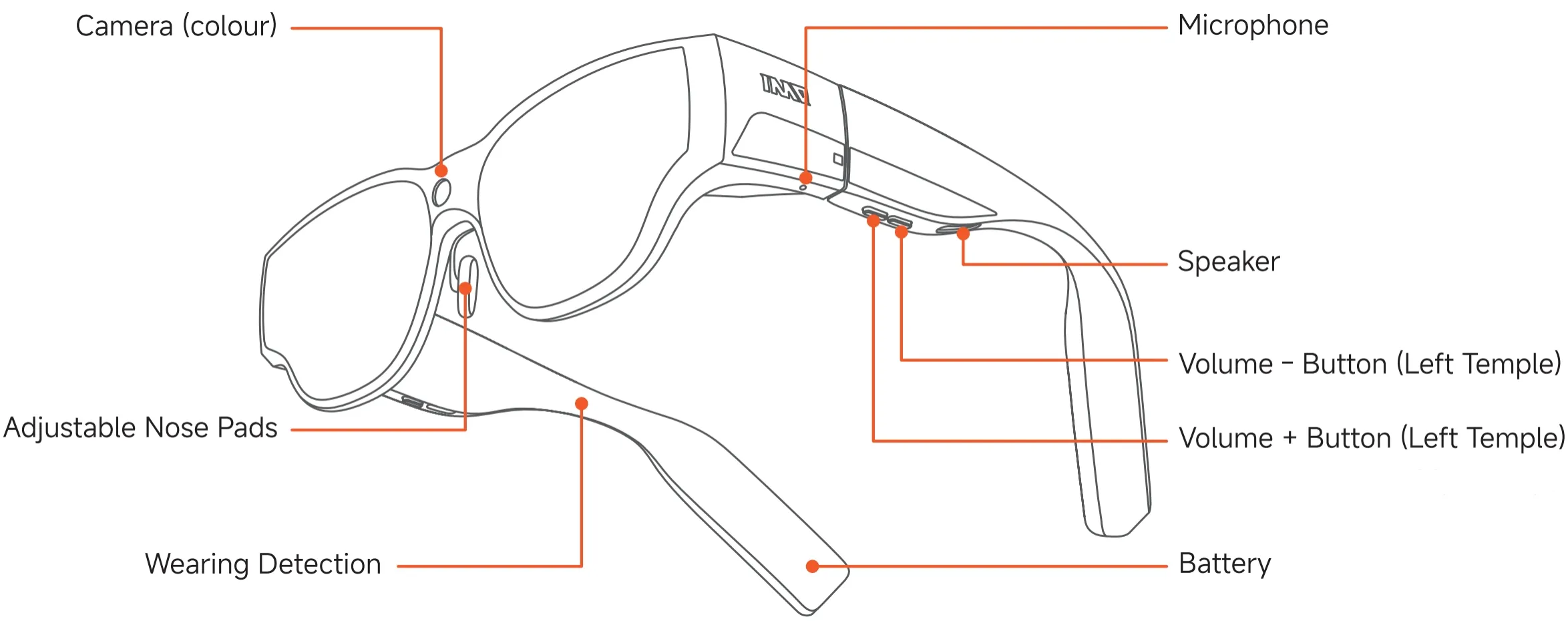 Section titled “Glasses”Tip: Use a 5V/1A charger. Fully charge before first use.