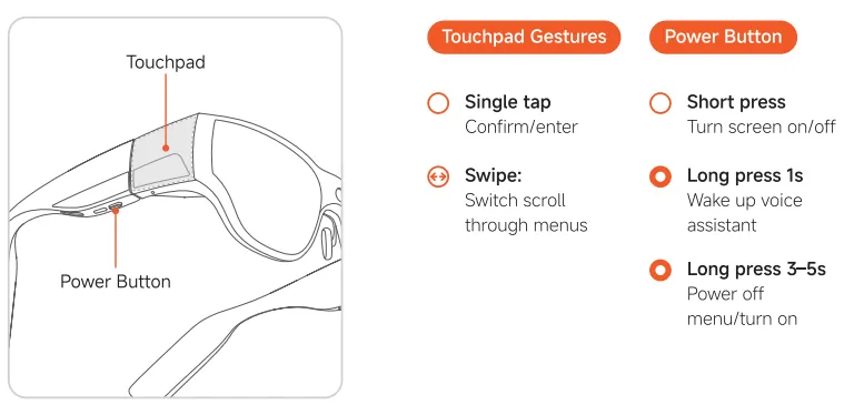 Section titled “Part 5 - Power on/off and restart your glasses”① Power Off/Restart: While the device is powered on, press and hold the power button on the temple for 3 seconds to display the power options menu. Swipe the touchpad to select “Shut down” or “Restart.”