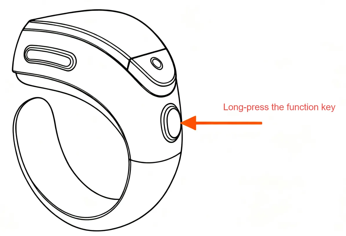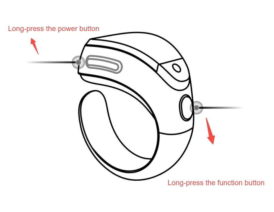 - Long-press the ring’s power button to turn it off, then long-press both the power button and function button to turn it on (reset).