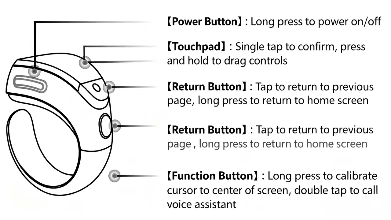 Section titled “Part 4 Ring Indicator Light”Long-press the function key on the ring to calibrate the cursor/ray to the center of the screen.Note: The ray function can only be used when entering [Spatial Multi-Screen/Discovery]