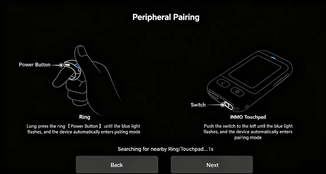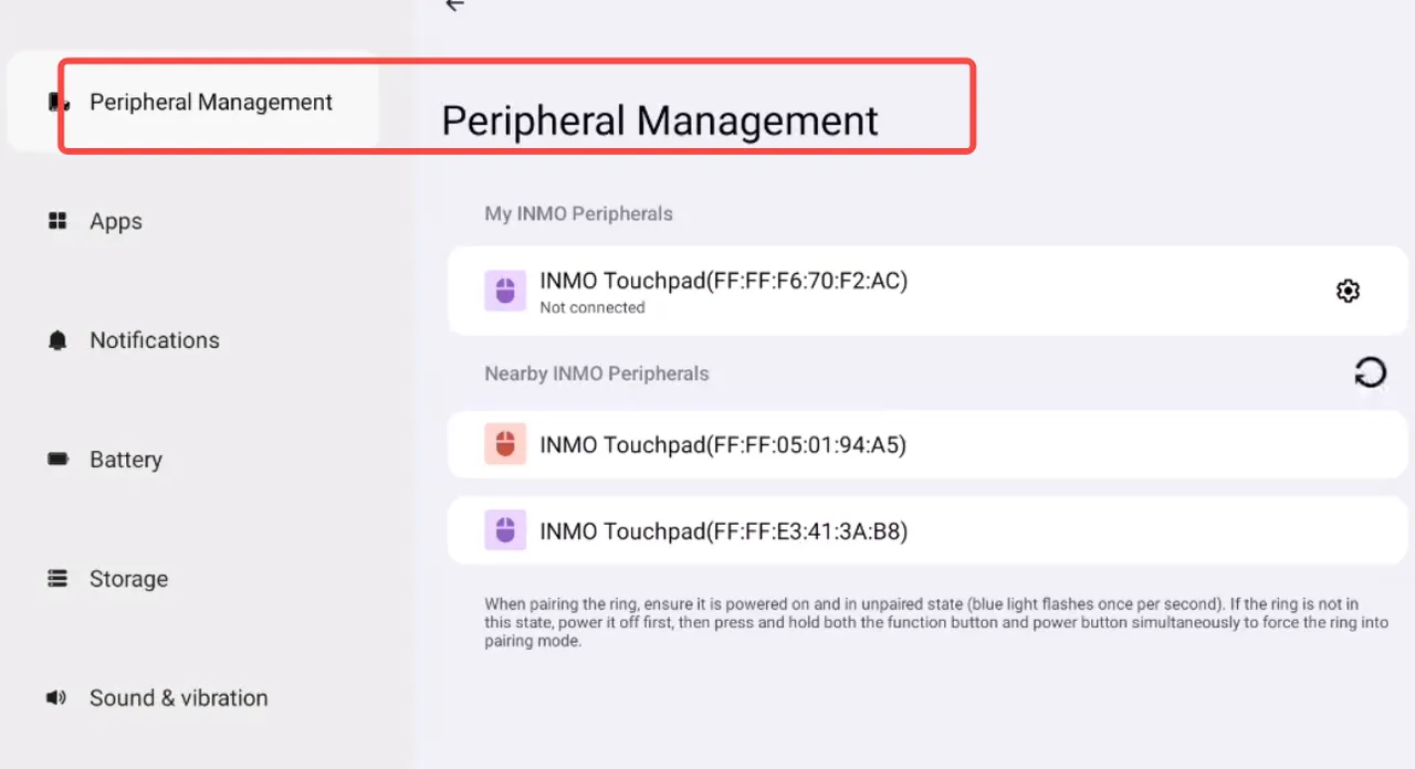 - Go to the glasses desktop -> Peripheral Management -> tap and search, then you’ll find the “INMO Ring 3” device. Tap to connect.