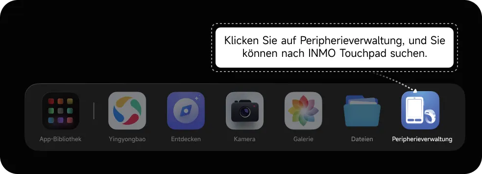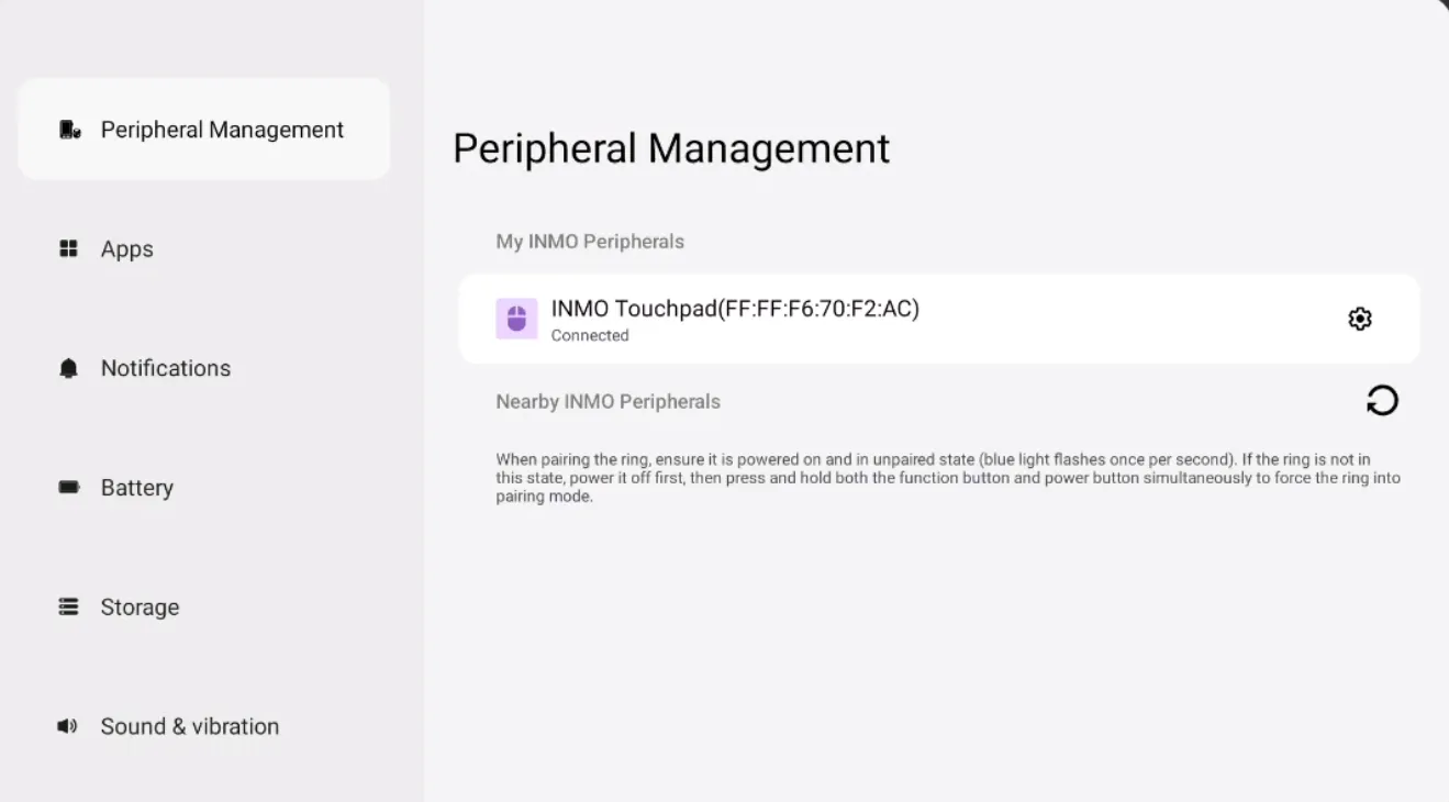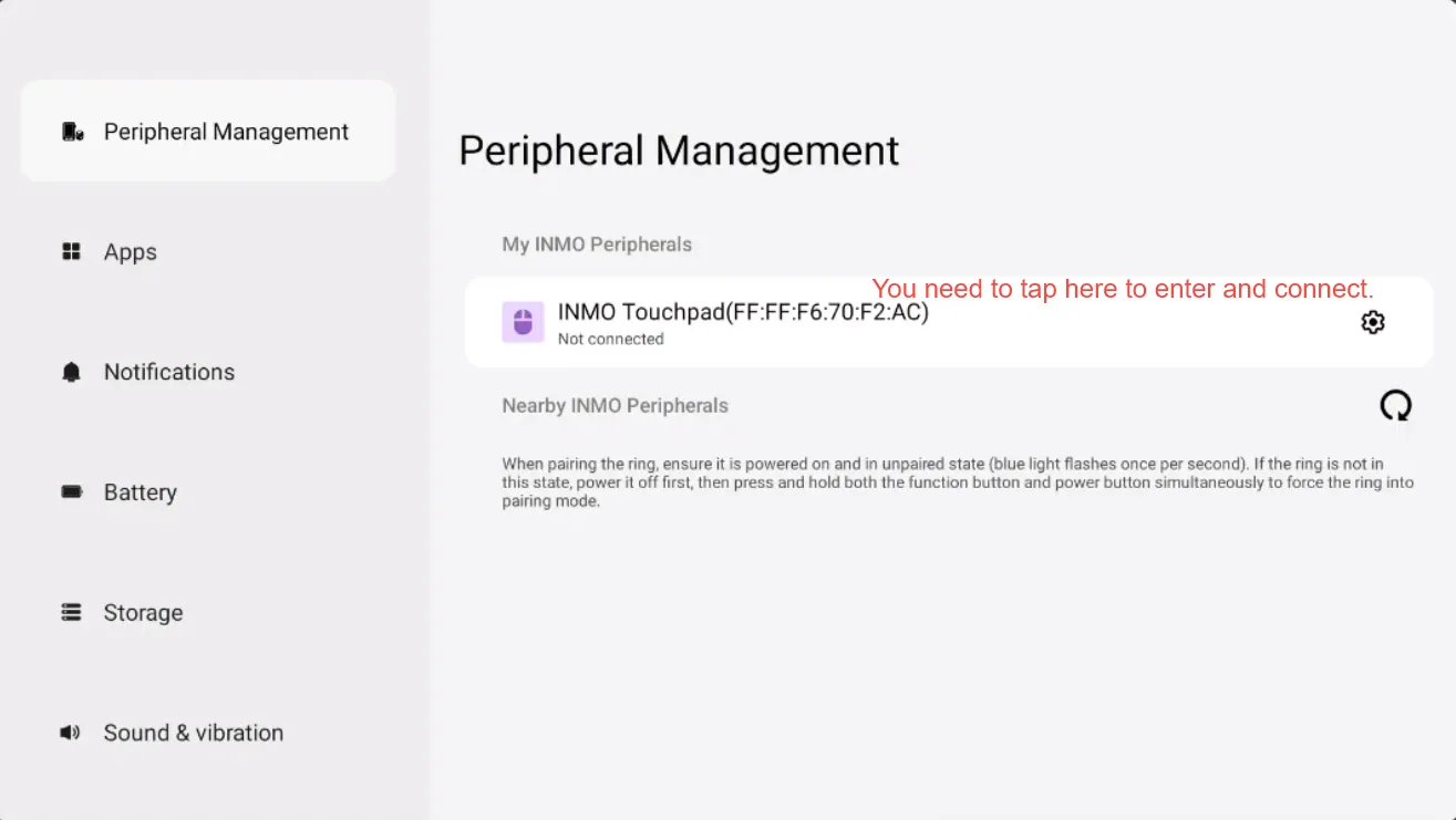 Section titled “Part 4 Glasses Connection”① Go to the desktop -> select “Peripheral Management” -> tap and search. You will find the “INMO Touchpad” device, then tap to connect.