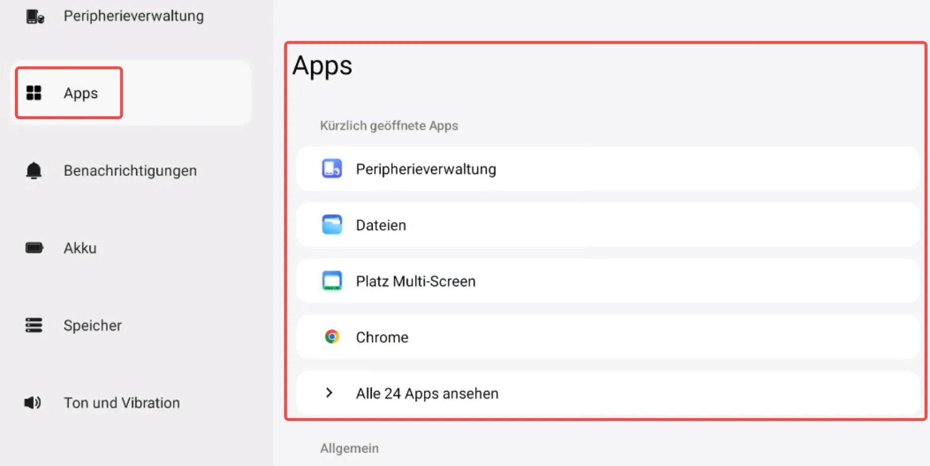 ② Tippen Sie auf “Apps”, um zuletzt verwendete Apps, alle Apps, Standard-Apps, inaktive Apps und speziellen App-Zugriff anzuzeigen.