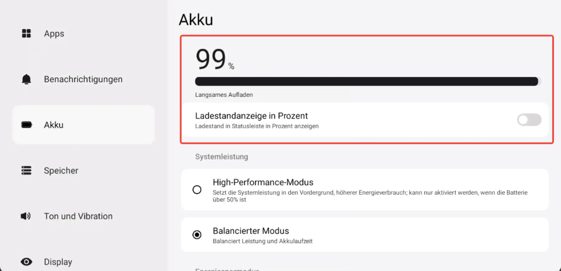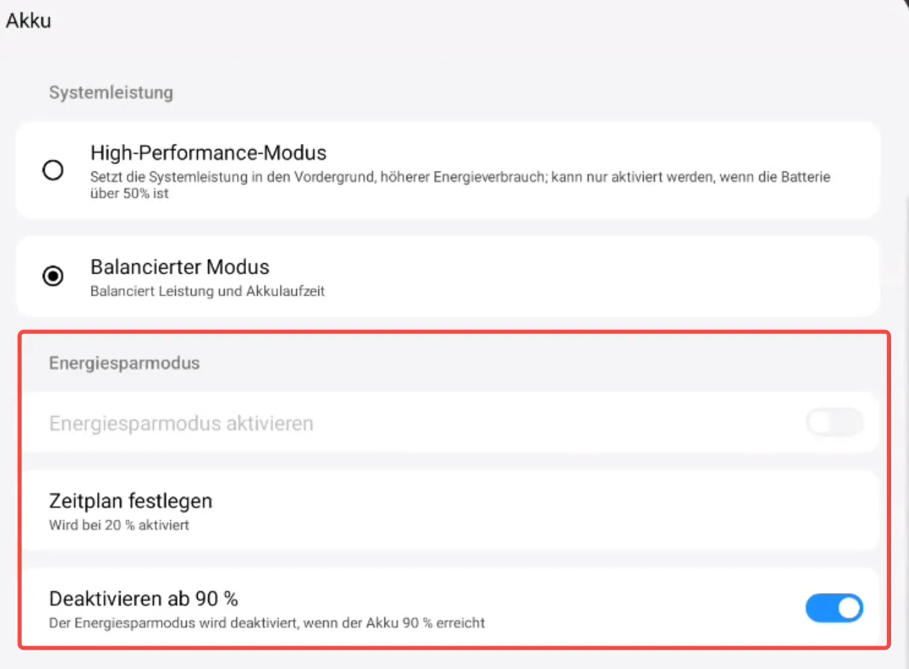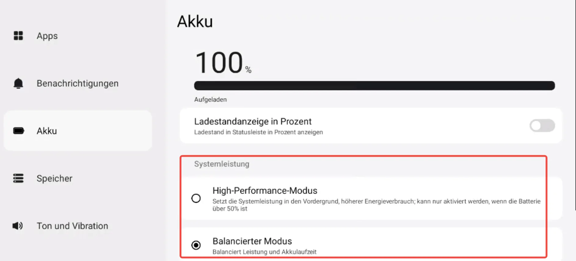 ③ Unter “Akku” → “Systemleistung” können Sie zwischen dem Hochleistungsmodus und dem Ausbalancierten Modus wechseln.