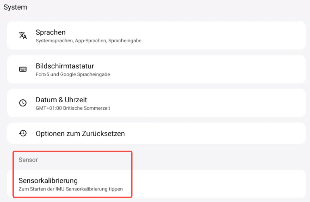 ② Tippen Sie auf “System” → “Sensoren” → “Sensorkalibrierung”. Ein Bestätigungston wird nach erfolgreicher Kalibrierung abgespielt, und ein Neustart ist erforderlich, damit die Änderungen wirksam werden.