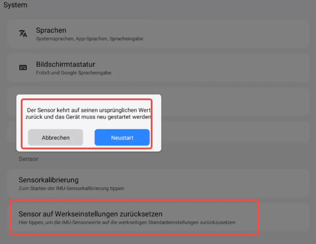③ “Sensoren” → “Sensoren auf Standardwerte zurücksetzen” erfordert einen Neustart des Geräts.