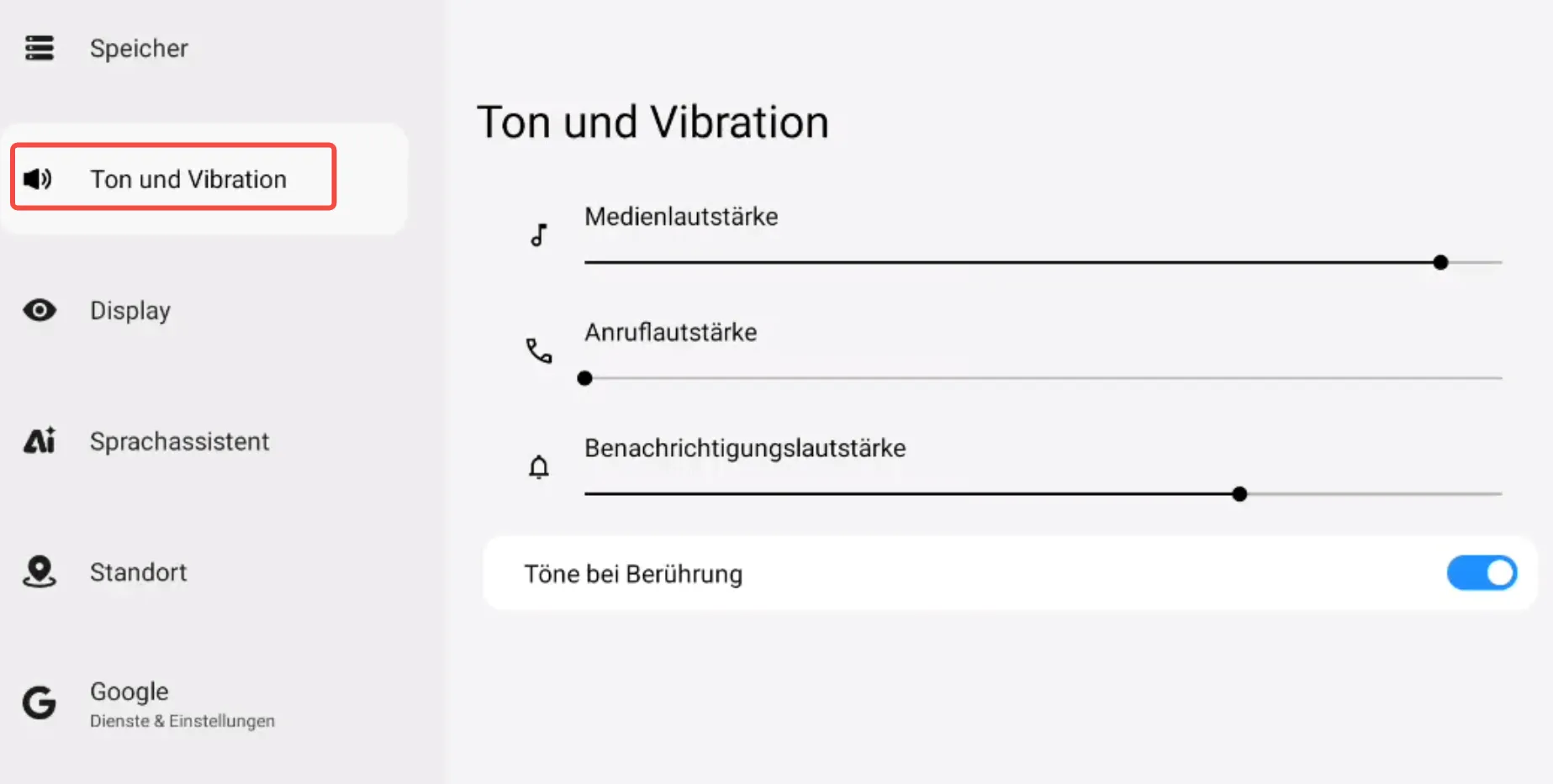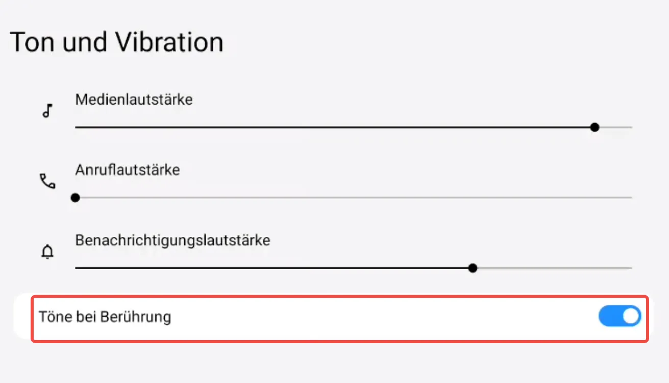 ② Tippen Sie auf “Töne und Vibration” → Sie können die Lautstärke für Medien, Anrufe und Benachrichtigungen anpassen.