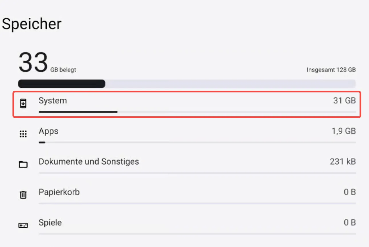 ③ “System” → Dies beinhaltet den Dateispeicher, der zum Ausführen von Android 14 verwendet wird.
