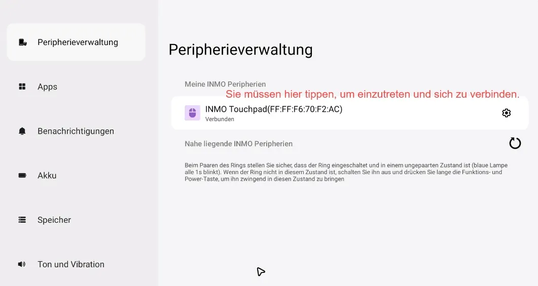 Abschnitt betitelt „Teil 4 - Verbindung mit den Brillen“① Gehen Sie zum Desktop -> wählen Sie “Peripheral Management” -> tippen Sie auf “tap and search”. Sie finden das Gerät “INMO Touchpad”, tippen Sie darauf, um die Verbindung herzustellen.