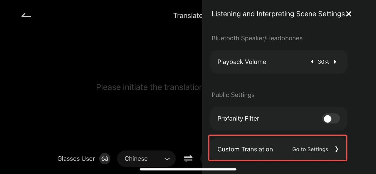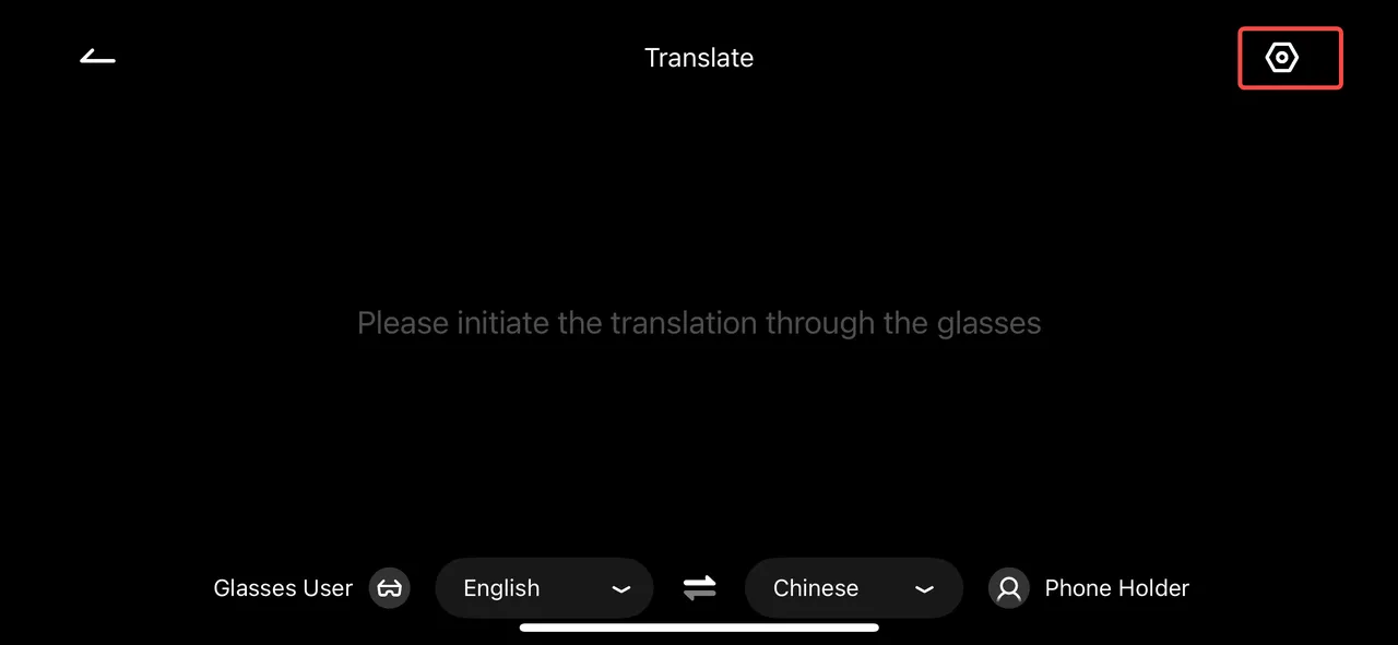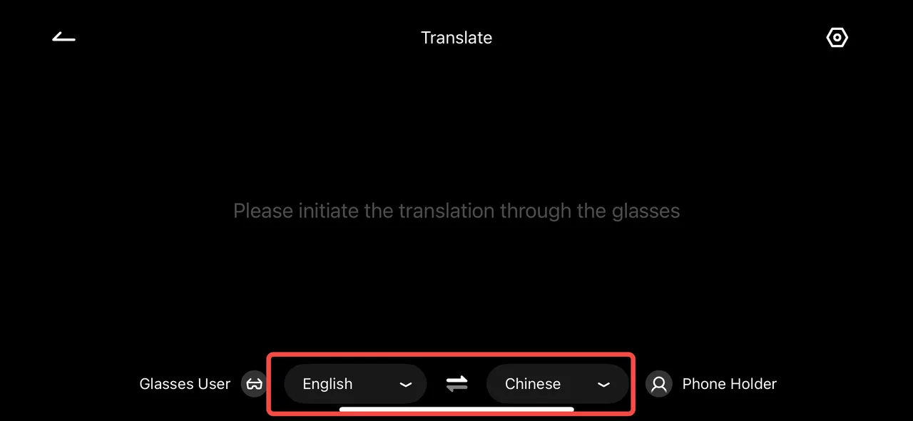 • Step1: Click on the right temple of the glasses home page and select “Translation” to enter the translation page. The upper half of the screen is the translated subtitle of the other party’s speech, and the lower half of the screen is the original subtitle of your own speech