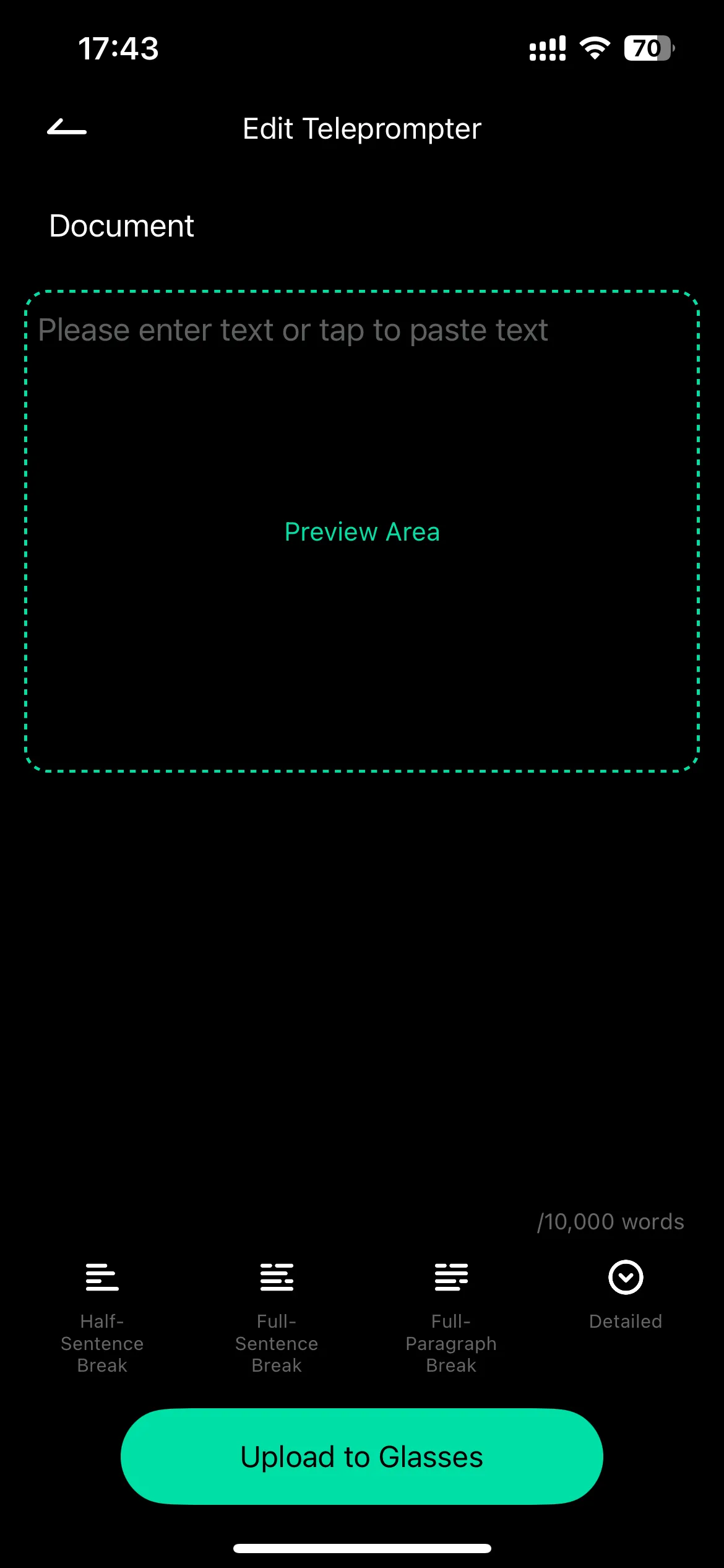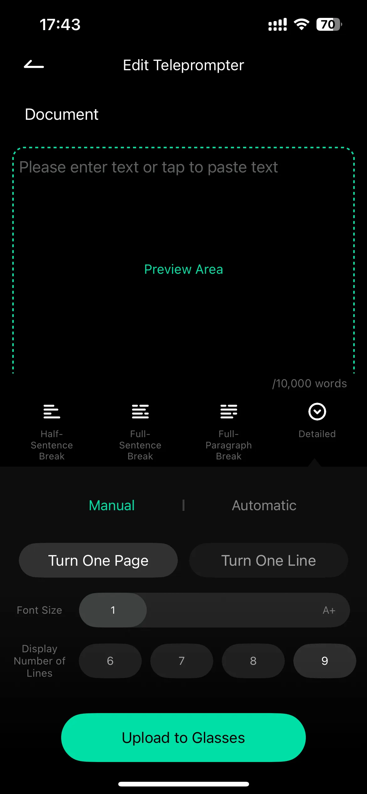• Step 3: Under the input preview area, you can set the text layout method, manual/automatic page turning speed, font size, and display line number. After setting the prompt content, click “Upload to glasses”