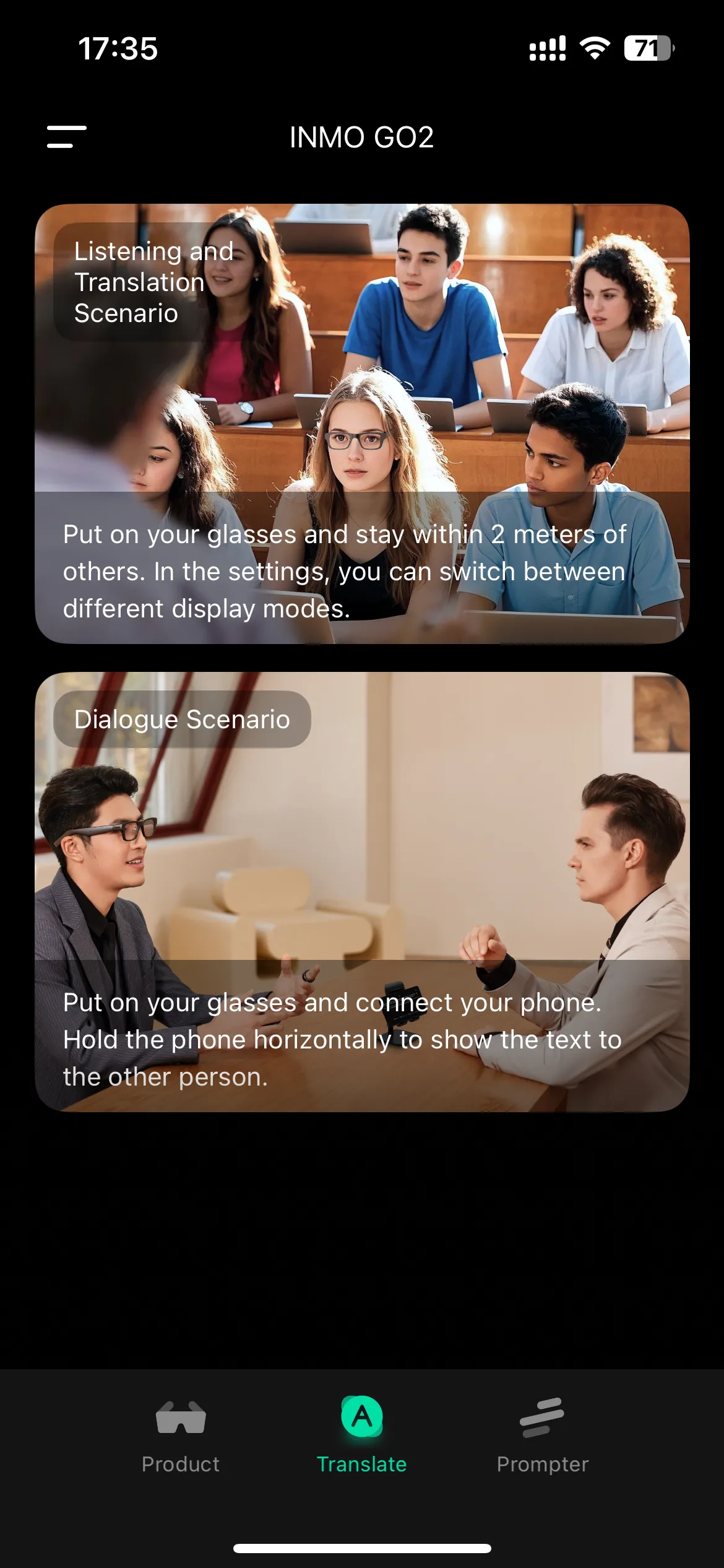 • Step 2: Open the INMO GO app on your phone, click “Translate” “Enter Translation”