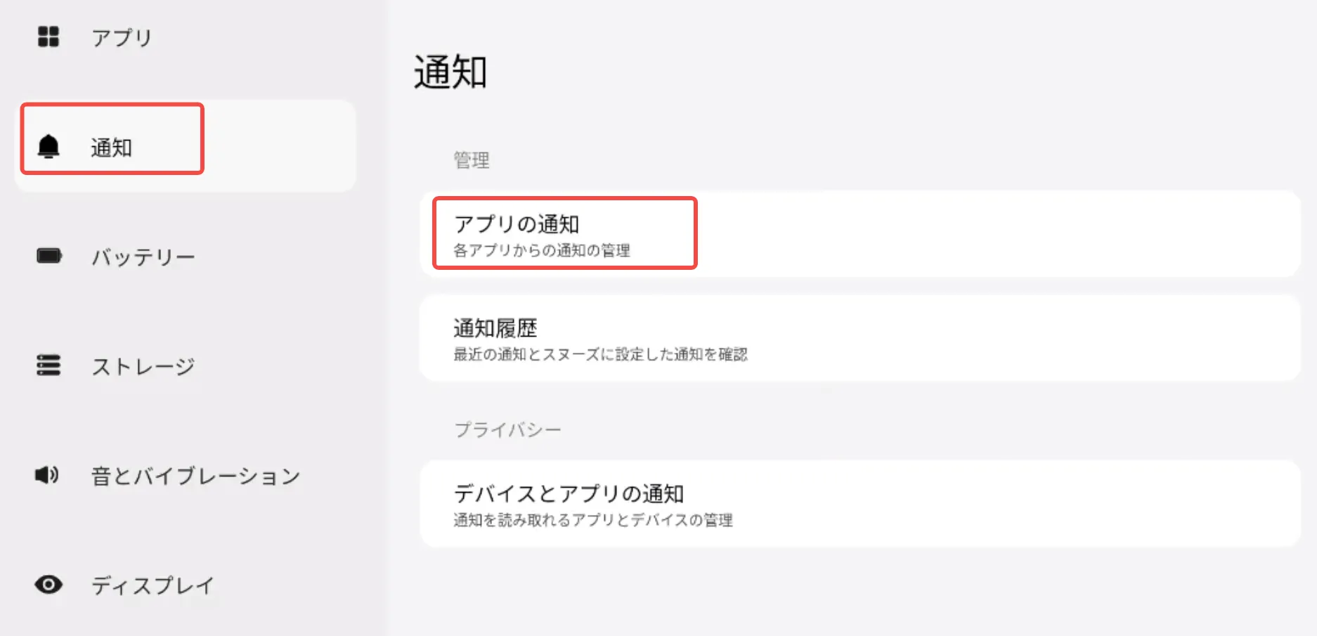 ② 「通知」→「アプリ通知」をタップして、個々のアプリからの通知を制御します。