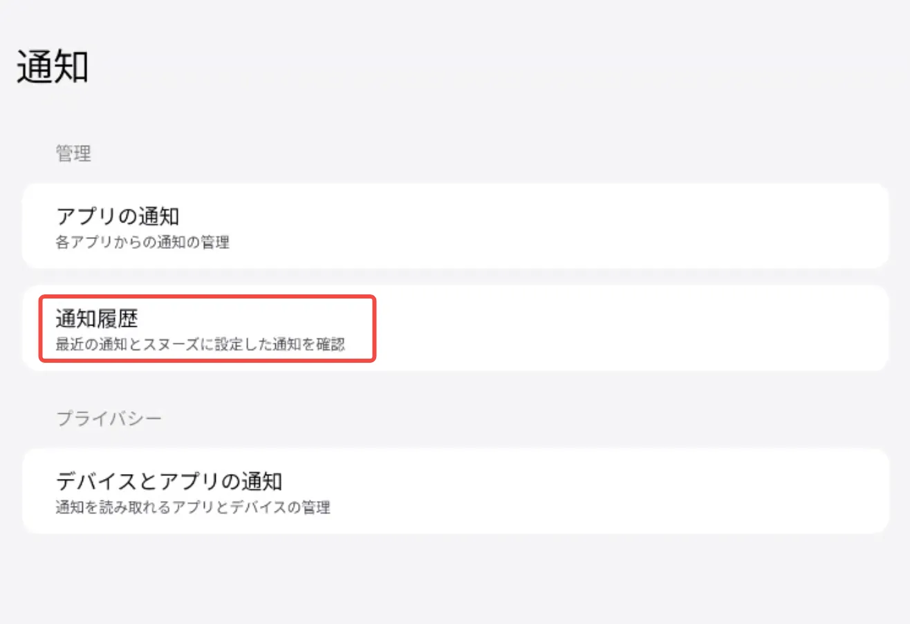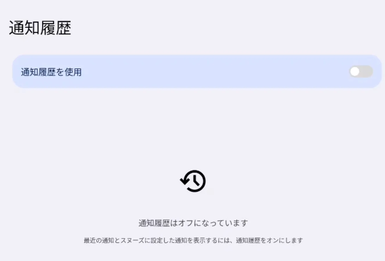 Section titled “パート 2 通知履歴とアクセス許可”① 「通知」→「通知履歴」を有効にすると、最近の通知がここに表示されます。