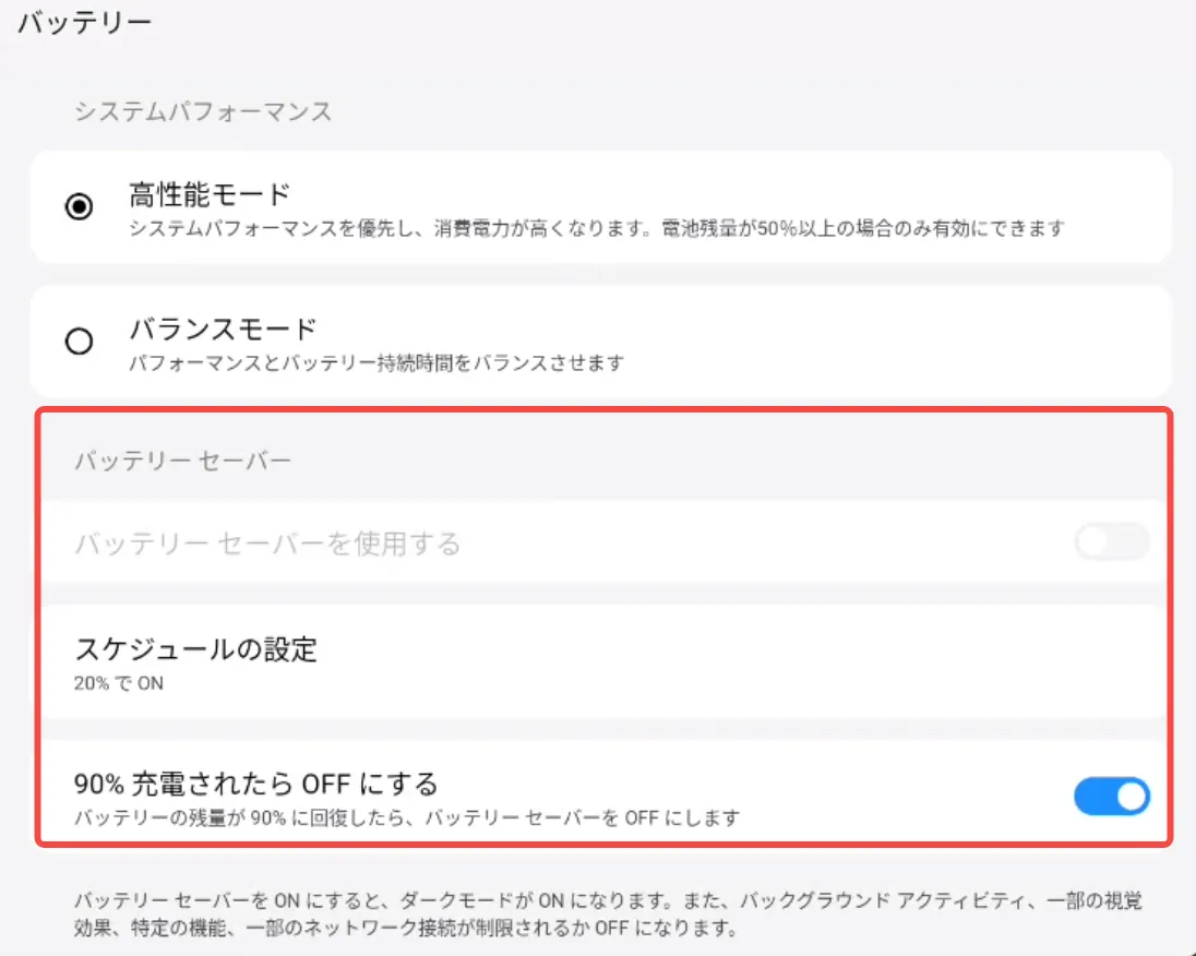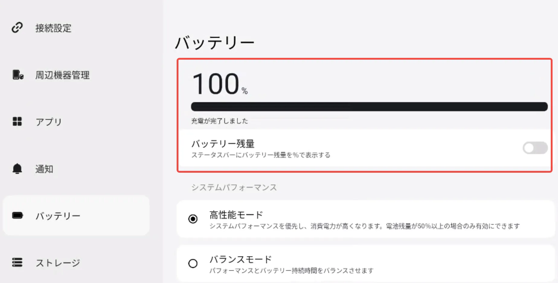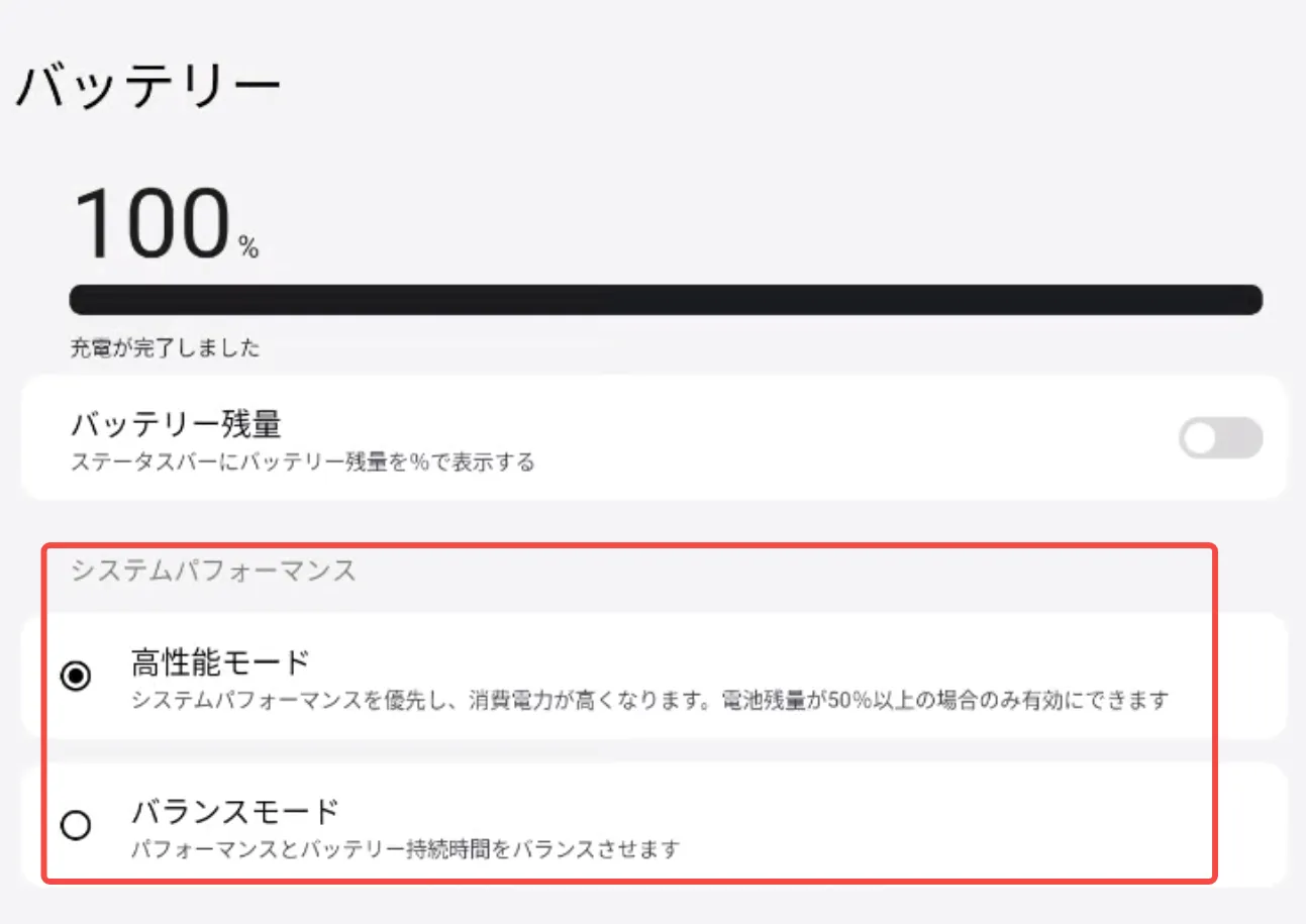③ 「バッテリー」→「システムパフォーマンス」で、ハイパフォーマンスモードとバランスモードを切り替えることができます。