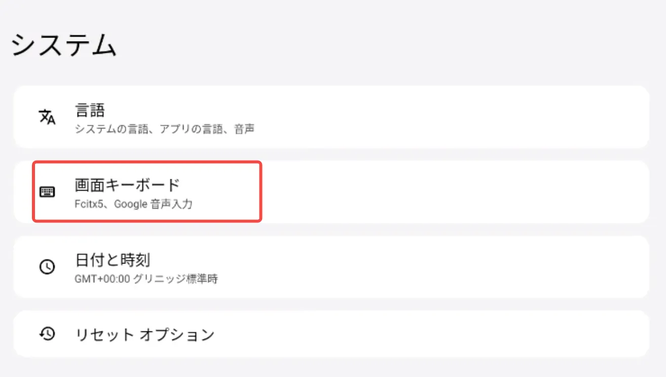 ① 「システム」→「オンスクリーンキーボード」をタップして、希望する入力方法キーボードを選択します。