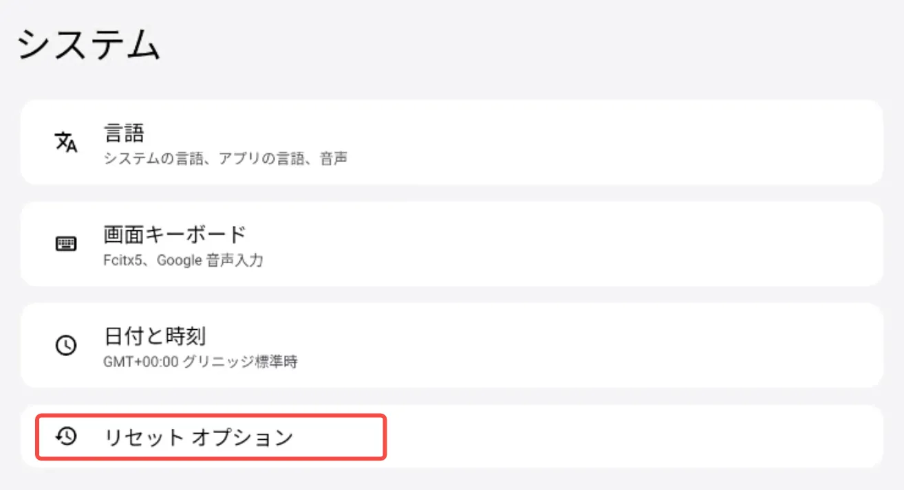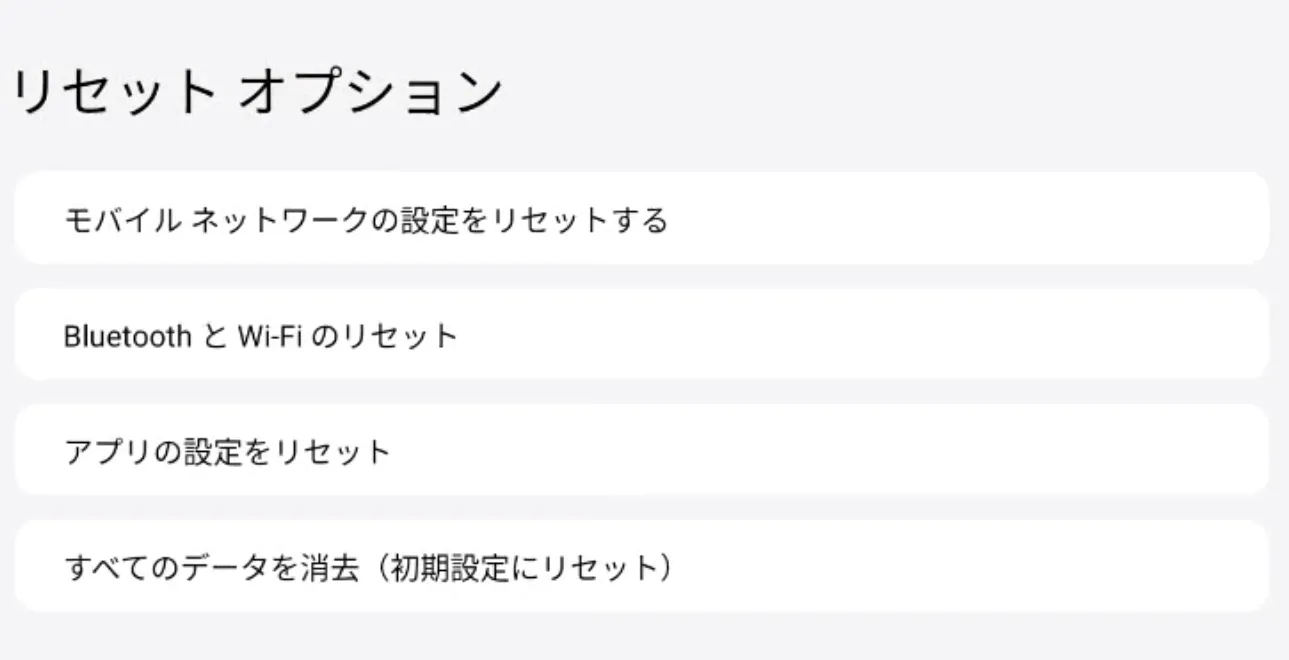 ③ 「システム」→「リセットオプション」をタップ → 次のオプションを選択できます:モバイルネットワーク設定のリセット、BluetoothとWLANのリセット、アプリ設定のリセット、および全データの消去(工場出荷時リセット)。