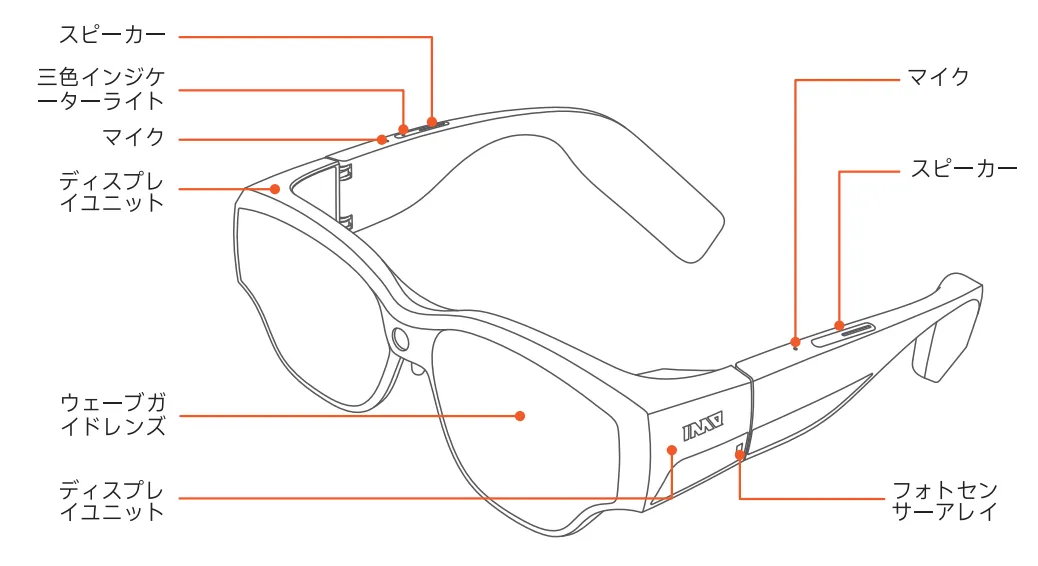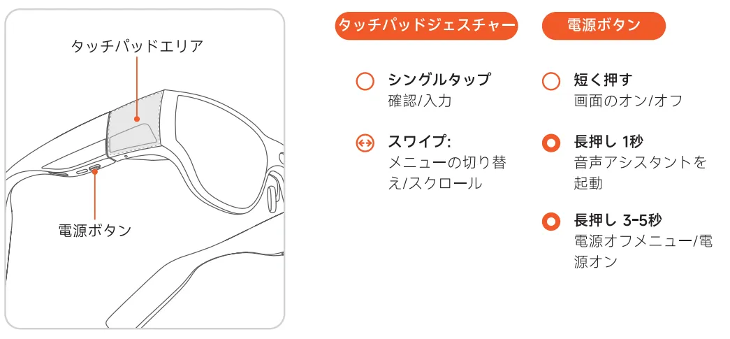 Section titled “ステップ 5 - 電源のオン/オフと再起動”① 電源オフ/再起動: デバイスの電源が入っている状態で、テンプルの電源ボタンを3秒間長押しすると電源オプションメニューが表示されます。タッチパッドをスワイプして「シャットダウン」または「再起動」を選択します。