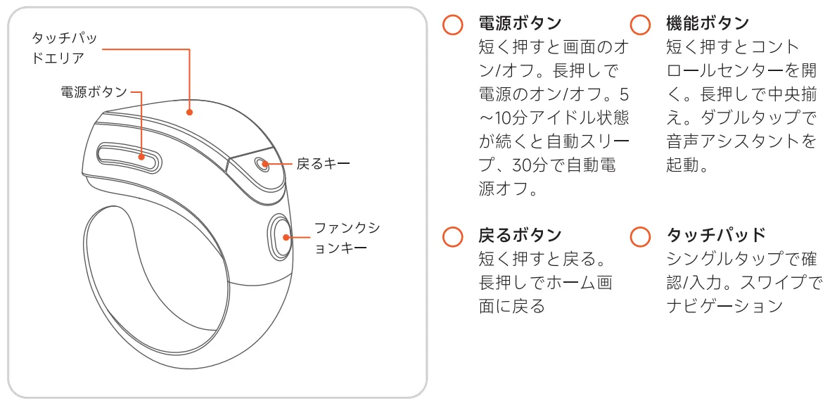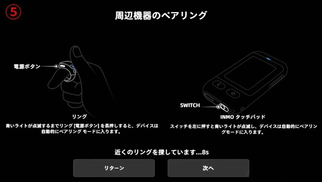 Section titled “ステップ 3 - リングとタッチパッドのペアリング”⑤ 周辺機器のペアリング: 「リング」または「タッチパッド」を接続します。接続が成功すると、自動的に「リング操作説明」へ進みます(タッチパッドを接続した場合は「タッチパッド操作説明」にリダイレクトされます)。