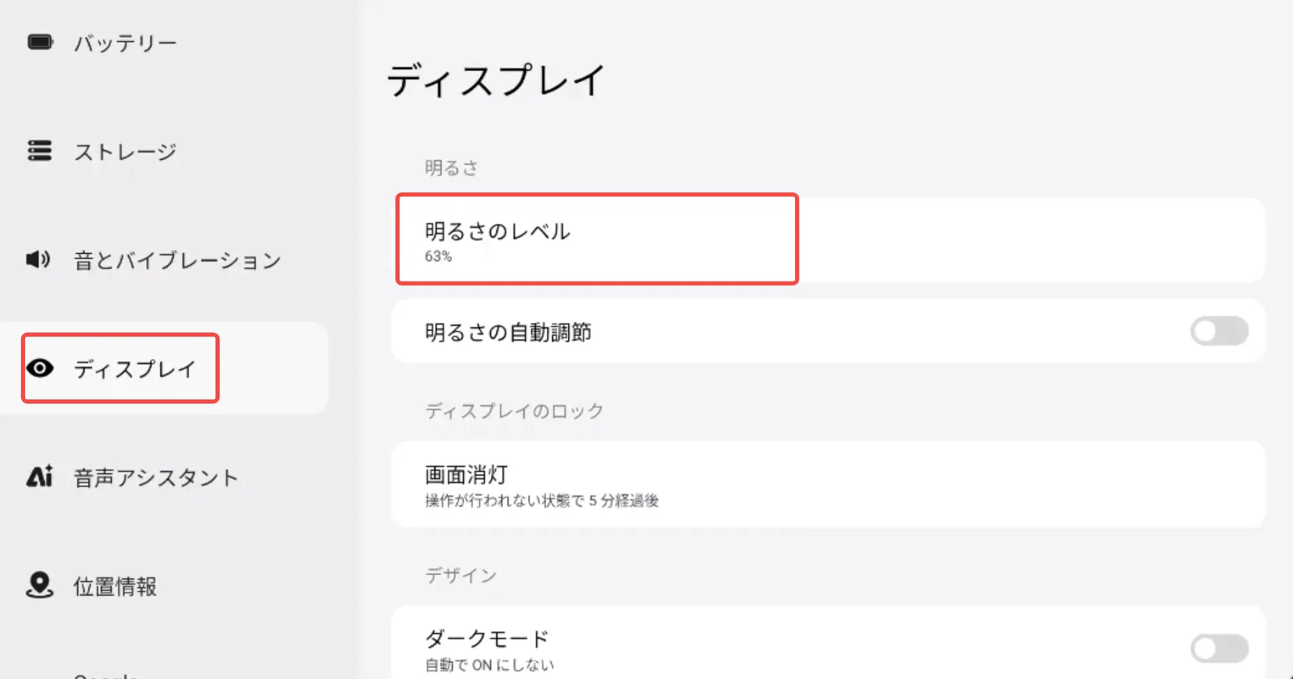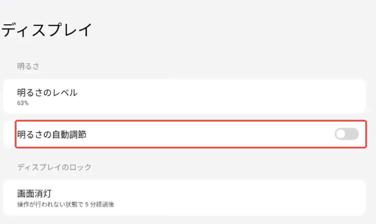 ③ アダプティブな明るさ → 有効にすると、明るさが自動的に調整されます。