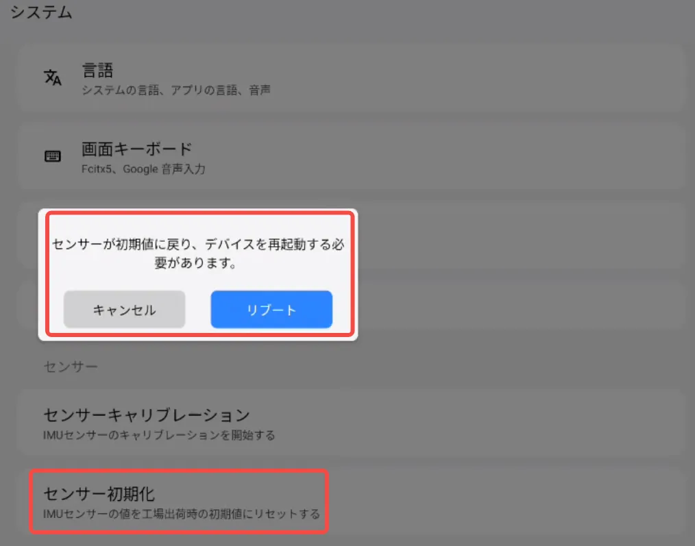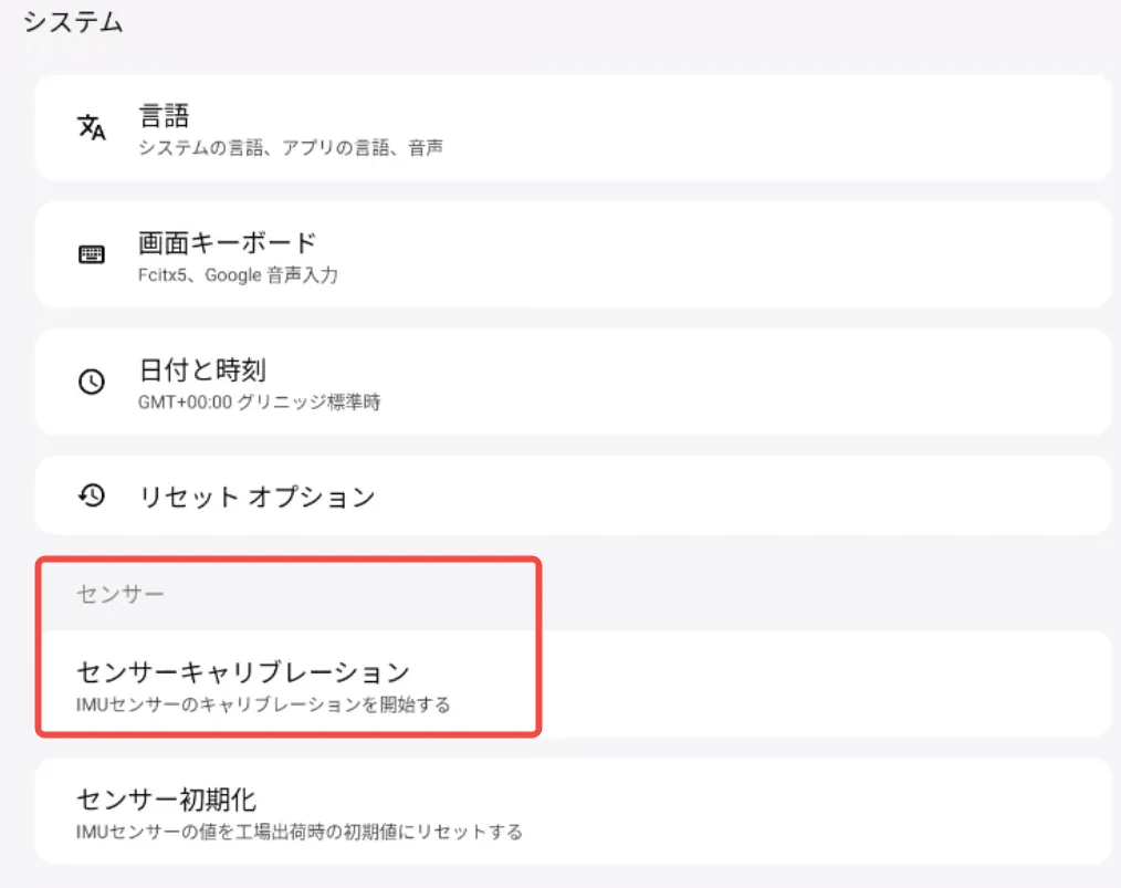② 「システム」→「センサー」→「センサーキャリブレーション」をタップします。キャリブレーションが成功するとプロンプト音が鳴り、変更を有効にするには再起動が必要です。