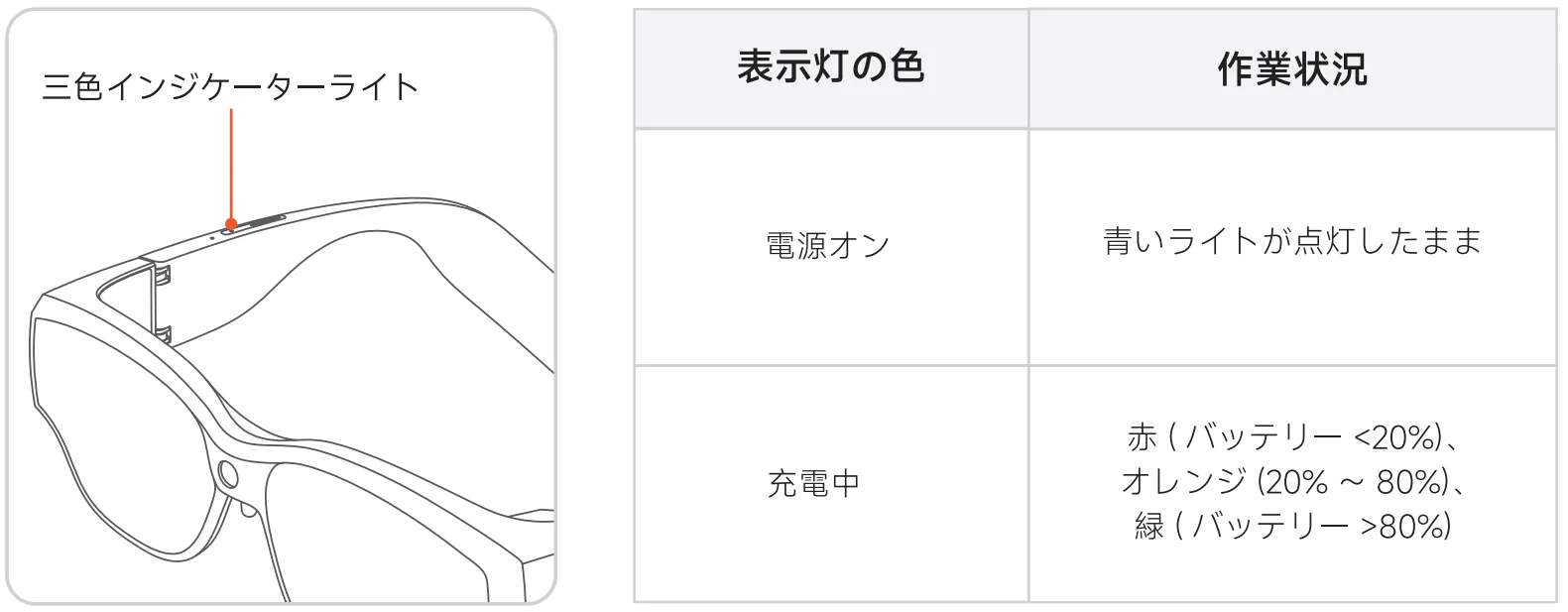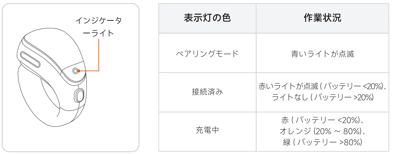 Section titled “パート 5 電源LEDインジケーター”ヒント: 5V/1Aの充電器を使用してください。初回使用前に完全に充電してください。