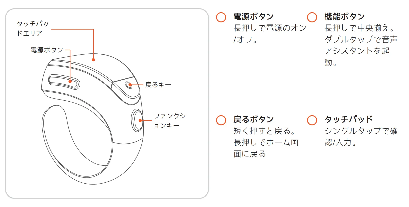 Section titled “ステップ 3 画面の指示に従う”セットアップとネットワークの有効化は、右側のタッチパッドまたはリングを使用して行ってください。